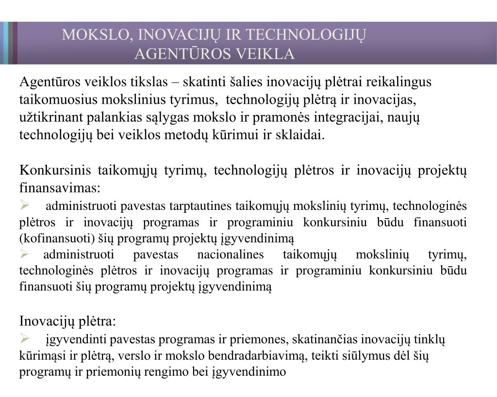 MOKSLO, INOVACIJŲ IR TECHNOLOGIJŲ AGENTŪROS VEIKLA • Agentūros veiklos tikslas – skatinti šalies inovacijų plėtrai reikalingus taikomuosius mokslinius tyrimus, technologijų plėtrą ir inovacijas, užtikrinant palankias sąlygas mokslo ir pramonės integracijai, naujų technologijų bei veiklos metodų kūrimui ir sklaidai. • Konkursinis taikomųjų tyrimų, technologijų plėtros ir inovacijų projektų finansavimas: • administruoti pavestas tarptautines taikomųjų mokslinių tyrimų, technologinės plėtros ir inovacijų programas ir programiniu konkursiniu būdu finansuoti (kofinansuoti) šių programų projektų įgyvendinimą • administruoti pavestas nacionalines taikomųjų mokslinių tyrimų, technologinės plėtros ir inovacijų programas ir programiniu konkursiniu būdu finansuoti šių programų projektų įgyvendinimą • Inovacijų plėtra: • įgyvendinti pavestas programas ir priemones, skatinančias inovacijų tinklų kūrimąsi ir plėtrą, verslo ir mokslo bendradarbiavimą, teikti siūlymus dėl šių programų ir priemonių rengimo bei įgyvendinimo