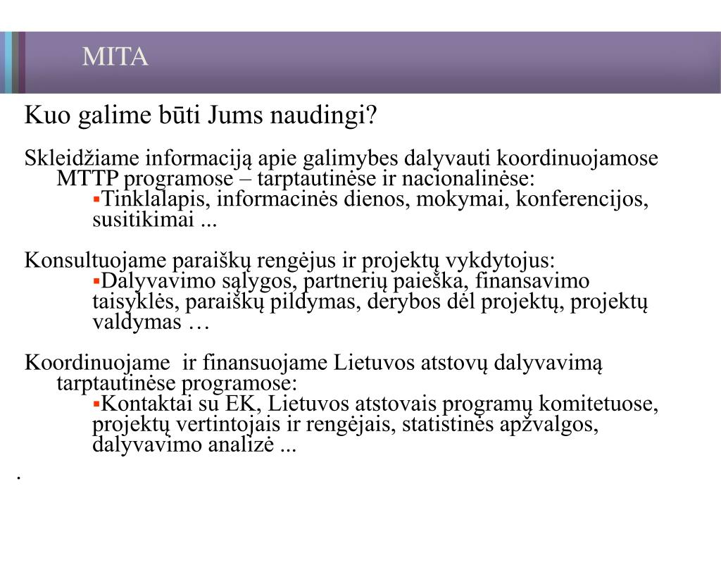 MITA Kuo galime būti Jums naudingi? • Skleidžiame informaciją apie galimybes dalyvauti koordinuojamose MTTP programose – tarptautinėse ir nacionalinėse: • Tinklalapis, informacinės dienos, mokymai, konferencijos, susitikimai ... • Konsultuojame paraiškų rengėjus ir projektų vykdytojus: • Dalyvavimo sąlygos, partnerių paieška, finansavimo taisyklės, paraiškų pildymas, derybos dėl projektų, projektų valdymas … • Koordinuojame ir finansuojame Lietuvos atstovų dalyvavimą tarptautinėse programose: • Kontaktai su EK, Lietuvos atstovais programų komitetuose, projektų vertintojais ir rengėjais, statistinės apžvalgos, dalyvavimo analizė ... • .