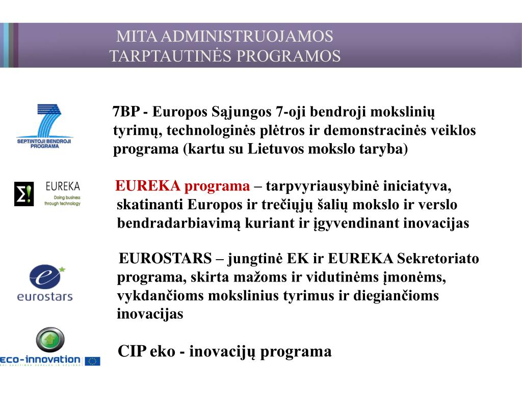 MITA ADMINISTRUOJAMOS TARPTAUTINĖS PROGRAMOS • 7BP - Europos Sąjungos 7-oji bendroji mokslinių • tyrimų, technologinės plėtros ir demonstracinės veiklos • programa (kartu su Lietuvos mokslo taryba) • EUREKA programa – tarpvyriausybinė iniciatyva, • skatinanti Europos ir trečiųjų šalių mokslo ir verslo • bendradarbiavimą kuriant ir įgyvendinant inovacijas • EUROSTARS – jungtinė EK ir EUREKA Sekretoriato • programa, skirta mažoms ir vidutinėms įmonėms, • vykdančioms mokslinius tyrimus ir diegiančioms • inovacijas • CIP eko - inovacijų programa
