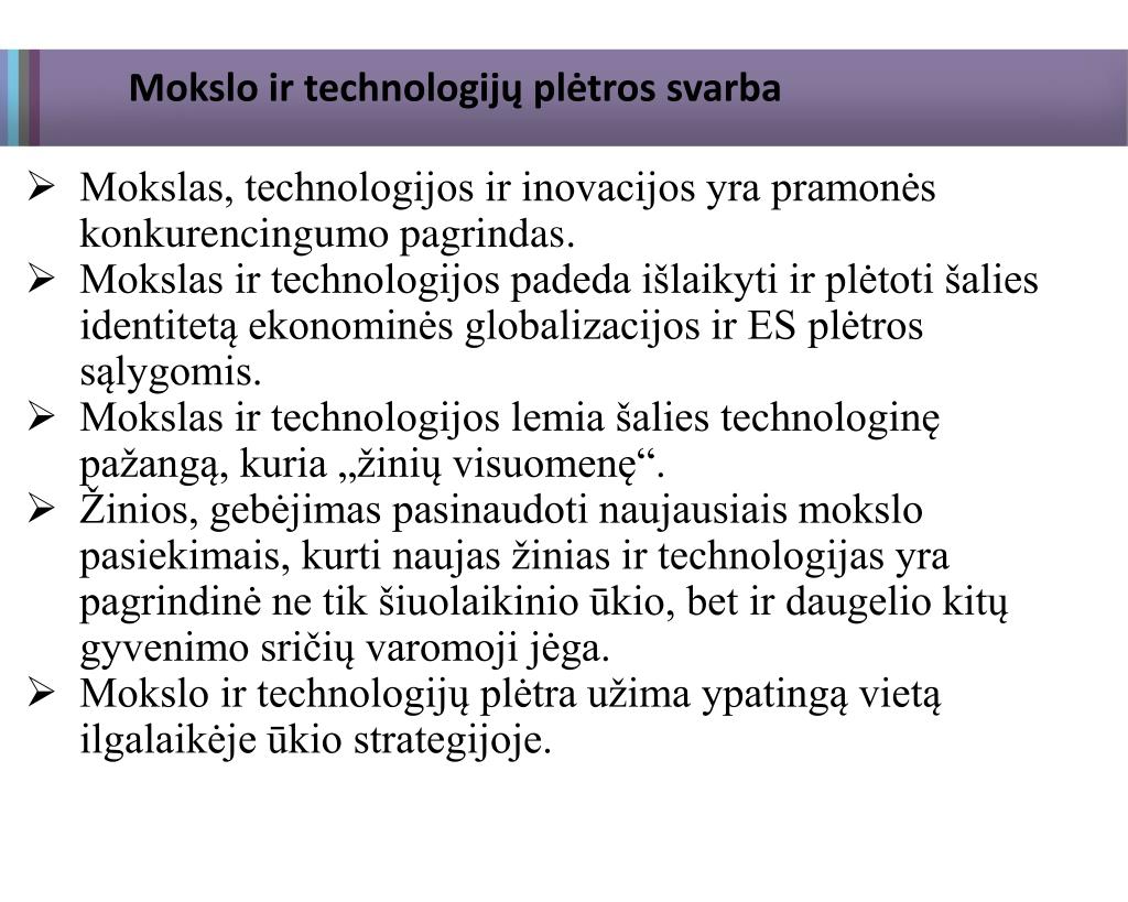 Mokslo ir technologijų plėtros svarba • Mokslas, technologijos ir inovacijos yra pramonės konkurencingumo pagrindas. • Mokslas ir technologijos padeda išlaikyti ir plėtoti šalies identitetą ekonominėsglobalizacijos ir ES plėtros sąlygomis. • Mokslas ir technologijos lemia šalies technologinę pažangą, kuria „žinių visuomenę“. • Žinios, gebėjimas pasinaudoti naujausiais mokslo pasiekimais, kurti naujas žinias ir technologijas yra pagrindinė ne tik šiuolaikinio ūkio, bet ir daugelio kitų gyvenimo sričių varomoji jėga. • Mokslo ir technologijų plėtra užima ypatingą vietą ilgalaikėje ūkio strategijoje.