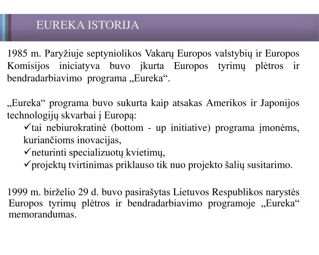 EUREKA ISTORIJA • 1985 m. Paryžiuje septyniolikos Vakarų Europos valstybių ir Europos Komisijos iniciatyva buvo įkurta Europos tyrimų plėtros ir bendradarbiavimo programa „Eureka“. • „Eureka“ programa buvo sukurta kaip atsakas Amerikos ir Japonijos technologijų skvarbai į Europą: • tai nebiurokratinė (bottom - up initiative) programa įmonėms, kuriančioms inovacijas, • neturinti specializuotų kvietimų, • projektų tvirtinimas priklauso tik nuo projekto šalių susitarimo. • 1999 m. birželio 29 d. buvo pasirašytasLietuvosRespublikosnarystėsEuropostyrimųplėtros irbendradarbiavimo programoje „Eureka“ memorandumas.