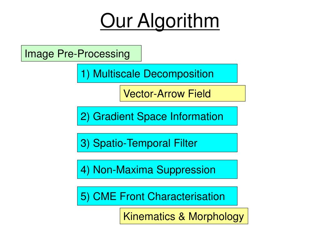 Our Algorithm Image Pre-Processing 1) Multiscale Decomposition Vector-Arrow Field 2) Gradient Space Information 3) Spatio-Temporal Filter 4) Non-Maxima Suppression 5) CME Front Characterisation Kinematics & Morphology