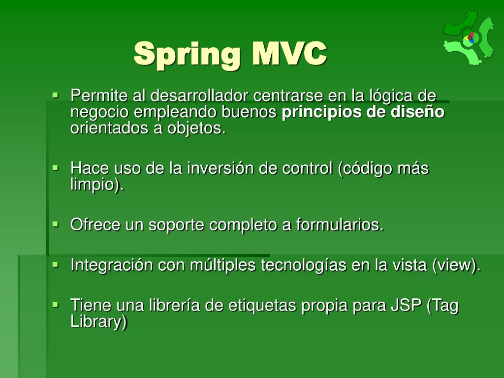 Spring MVC • Permite al desarrollador centrarse en la lógica de negocio empleando buenos principios de diseño orientados a objetos. • Hace uso de la inversión de control (código más limpio). • Ofrece un soporte completo a formularios. • Integración con múltiples tecnologías en la vista (view). • Tiene una librería de etiquetas propia para JSP (Tag Library)