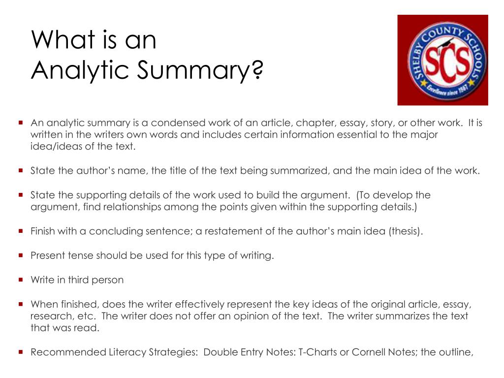 What is anAnalytic Summary? • An analytic summary is a condensed work of an article, chapter, essay, story, or other work. It is written in the writers own words and includes certain information essential to the major idea/ideas of the text. • State the author’s name, the title of the text being summarized, and the main idea of the work. • State the supporting details of the work used to build the argument. (To develop the argument, find relationships among the points given within the supporting details.) • Finish with a concluding sentence; a restatement of the author’s main idea (thesis). • Present tense should be used for this type of writing. • Write in third person • When finished, does the writer effectively represent the key ideas of the original article, essay, research, etc. The writer does not offer an opinion of the text. The writer summarizes the text that was read. • Recommended Literacy Strategies: Double Entry Notes: T-Charts or Cornell Notes; the outline,
