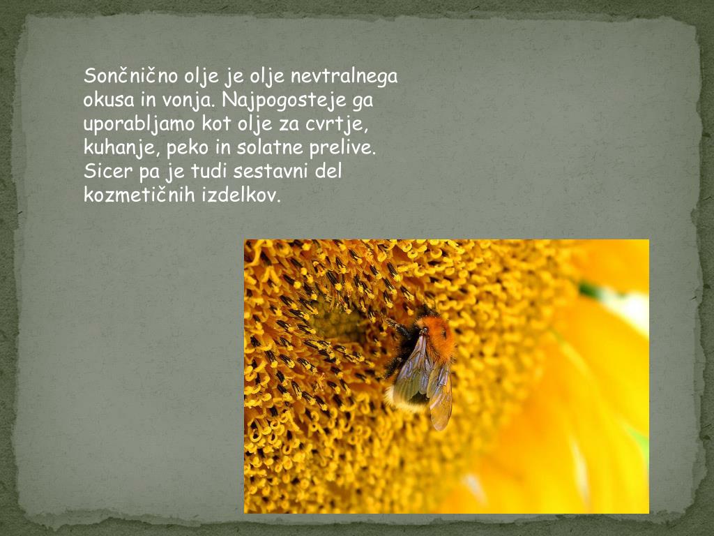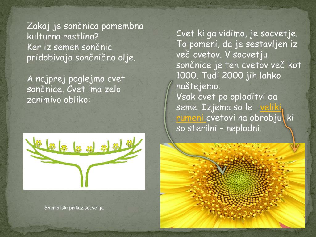 Zakaj je sončnica pomembna kulturna rastlina? Ker iz semen sončnic pridobivajo sončnično olje. A najprej poglejmo cvet sončnice. Cvet ima zelo zanimivo obliko: Cvet ki ga vidimo, je socvetje. To pomeni, da je sestavljen iz več cvetov. V socvetju sončnice je teh cvetov več kot 1000. Tudi 2000 jih lahko naštejemo. Vsak cvet po oploditvi da seme. Izjema so le veliki rumeni cvetovi na obrobju, ki so sterilni – neplodni. Shematski prikaz socvetja