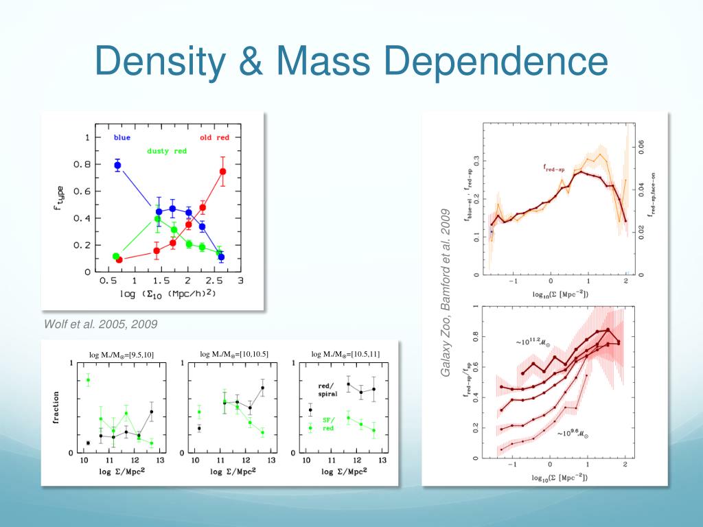Density & Mass Dependence Galaxy Zoo, Bamford et al. 2009 Wolf et al. 2005, 2009 log M*/M=[10,10.5] log M*/M=[10.5,11] log M*/M=[9.5,10]