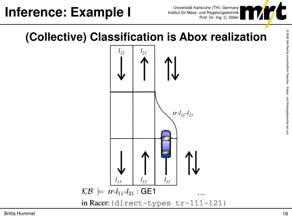 Inference: Example I (Collective) Classification is Abox realization l21 l22 tr-l11-l21 l13 l12 l11 17