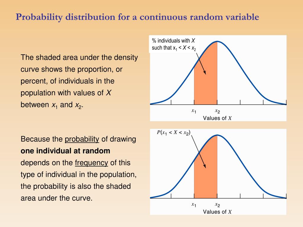 Probability distribution for a continuous random variable % individuals with X such that x1 < X < x2 The shaded area under the density curve shows the proportion, or percent, of individuals in the population with values of X between x1 and x2. Because the probability of drawing one individual atrandom depends on the frequency of this type of individual in the population, the probability is also the shaded area under the curve.