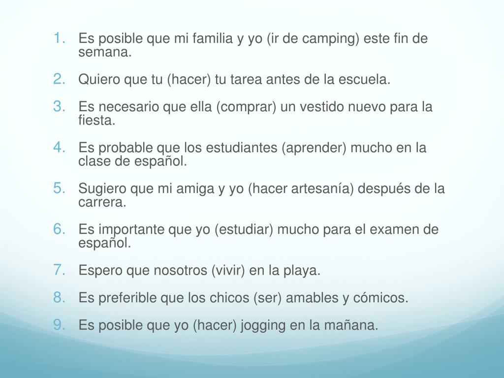 Es posible que mi familia y yo (ir de camping) este fin de semana. • Quiero que tu (hacer) tu tarea antes de la escuela. • Es necesario que ella (comprar) un vestido nuevo para la fiesta. • Es probable que los estudiantes (aprender) mucho en la clase de español. • Sugiero que mi amiga y yo (hacer artesanía) después de la carrera. • Es importante que yo (estudiar) mucho para el examen de español. • Espero que nosotros (vivir) en la playa. • Es preferible que los chicos (ser) amables y cómicos. • Es posible que yo (hacer) jogging en la mañana.