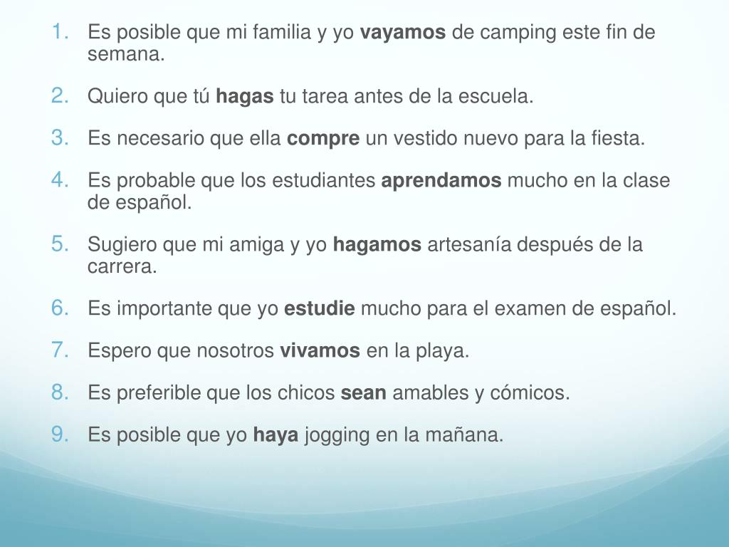 Es posible que mi familia y yo vayamos de camping este fin de semana. • Quiero que tú hagas tu tarea antes de la escuela. • Es necesario que ella compre un vestido nuevo para la fiesta. • Es probable que los estudiantes aprendamos mucho en la clase de español. • Sugiero que mi amiga y yo hagamos artesanía después de la carrera. • Es importante que yo estudie mucho para el examen de español. • Espero que nosotros vivamos en la playa. • Es preferible que los chicos sean amables y cómicos. • Es posible que yo haya jogging en la mañana.