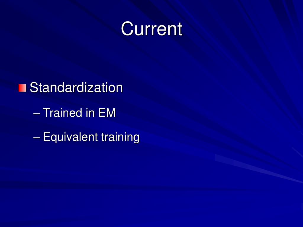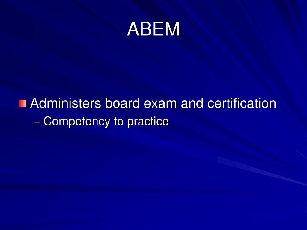 Current • Certified by the American Board of Emergency Medicine (ABEM) • Written exam • Oral exam • Continuing certification