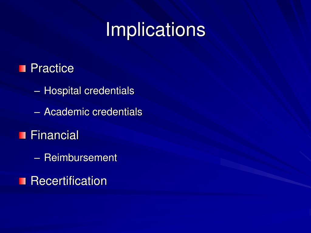 Implications • Practice • Hospital credentials • Academic credentials • Financial • Reimbursement • Recertification