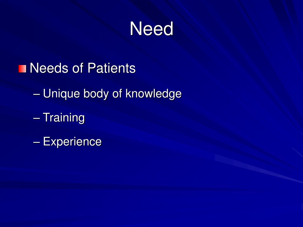 Need • Needs of Patients • Unique body of knowledge • Training • Experience