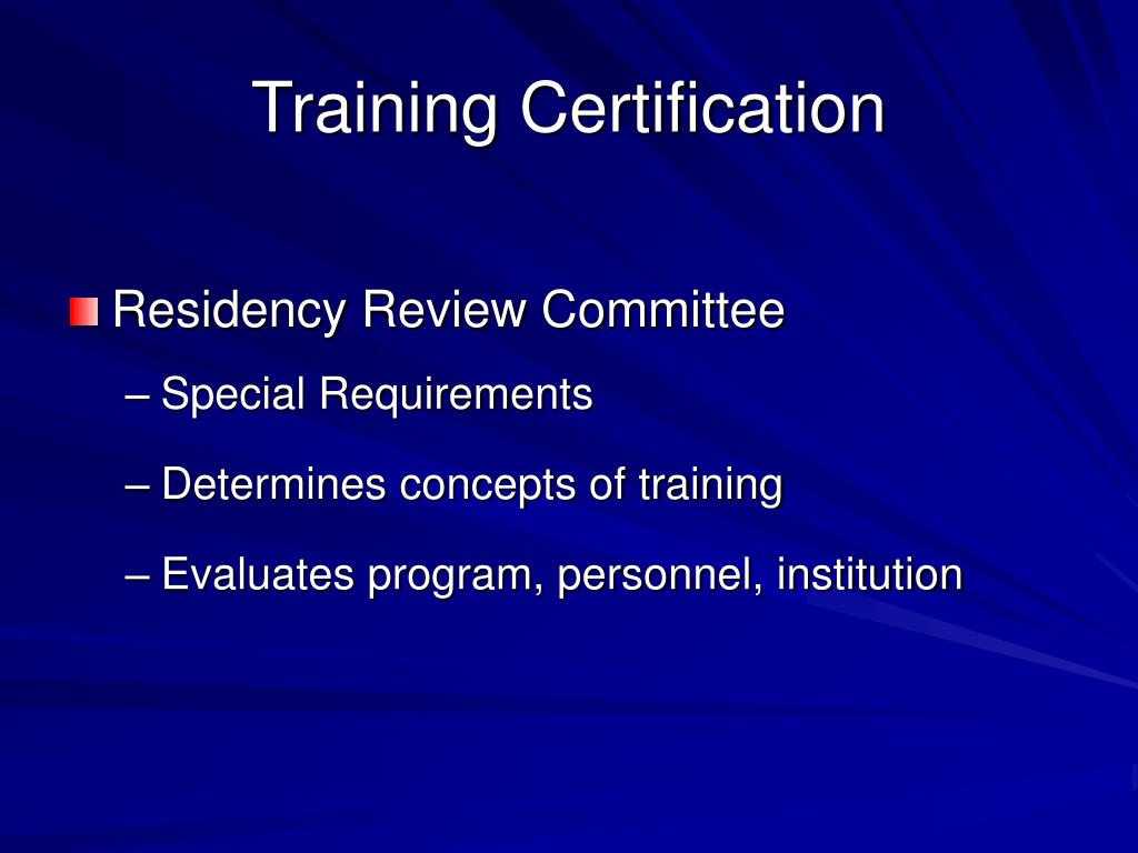 Training Certification • Residency Review Committee • Special Requirements • Determines concepts of training • Evaluates program, personnel, institution