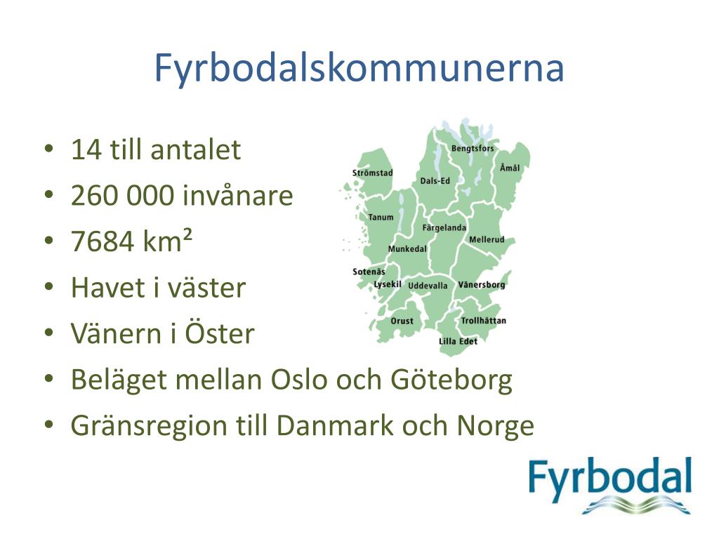 Fyrbodalskommunerna • 14 till antalet • 260 000 invånare • 7684 km² • Havet i väster • Vänern i Öster • Beläget mellan Oslo och Göteborg • Gränsregion till Danmark och Norge
