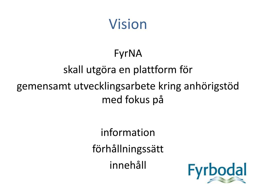 Vision FyrNA skall utgöra en plattform för gemensamt utvecklingsarbete kring anhörigstöd med fokus på information förhållningssätt innehåll