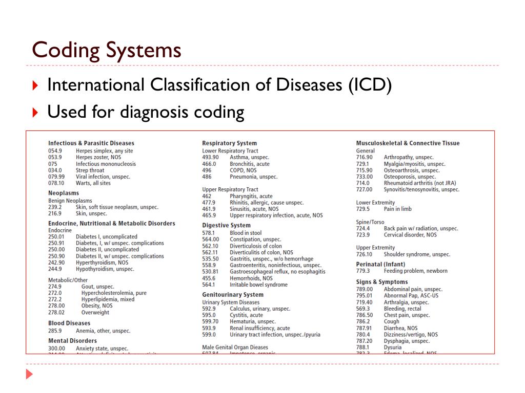Coding Systems • International Classification of Diseases (ICD) • Used for diagnosis coding