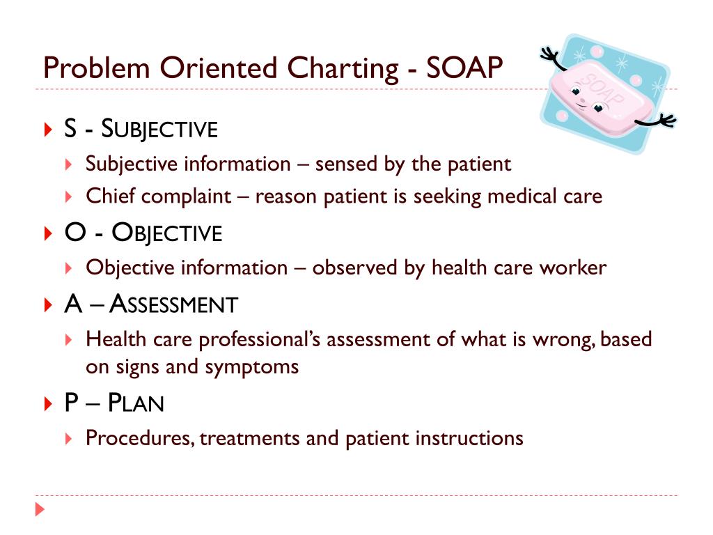 Problem Oriented Charting - SOAP • S - Subjective • Subjective information – sensed by the patient • Chief complaint – reason patient is seeking medical care • O - Objective • Objective information – observed by health care worker • A – Assessment • Health care professional’s assessment of what is wrong, based on signs and symptoms • P – Plan • Procedures, treatments and patient instructions