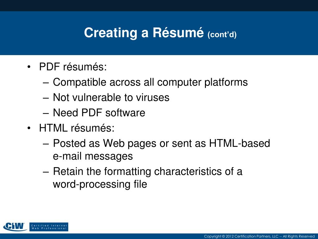 Creating a Résumé(cont’d) • PDF résumés: • Compatible across all computer platforms • Not vulnerable to viruses • Need PDF software • HTML résumés: • Posted as Web pages or sent as HTML-based e-mail messages • Retain the formatting characteristics of a word-processing file