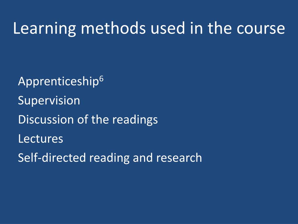 Learning methods used in the course Apprenticeship6 Supervision Discussion of the readings Lectures Self-directed reading and research