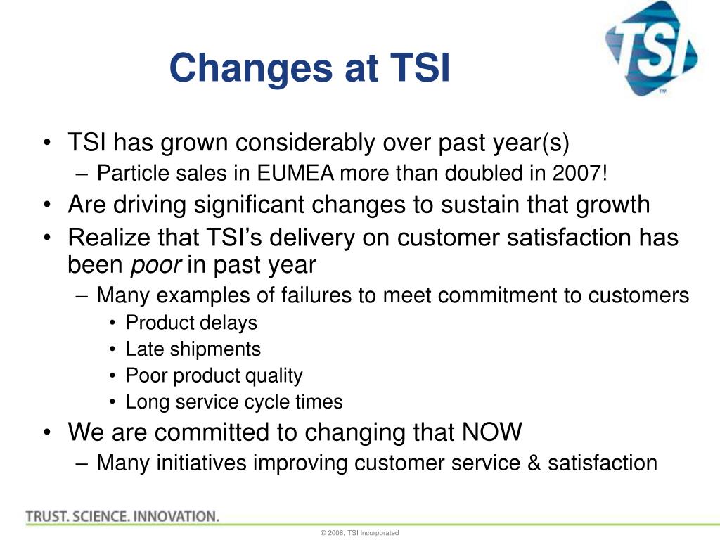 Changes at TSI • TSI has grown considerably over past year(s) • Particle sales in EUMEA more than doubled in 2007! • Are driving significant changes to sustain that growth • Realize that TSI’s delivery on customer satisfaction has been poor in past year • Many examples of failures to meet commitment to customers • Product delays • Late shipments • Poor product quality • Long service cycle times • We are committed to changing that NOW • Many initiatives improving customer service & satisfaction
