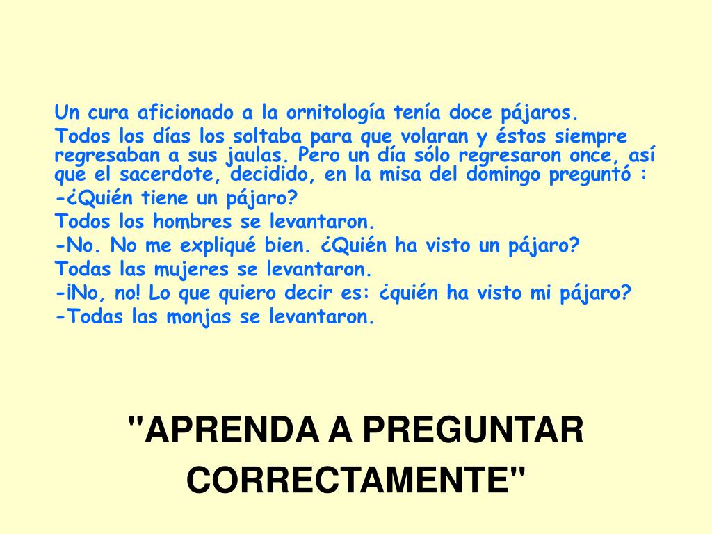 "APRENDA A PREGUNTAR CORRECTAMENTE" Un cura aficionado a la ornitología tenía doce pájaros. Todos los días los soltaba para que volaran y éstos siempre regresaban a sus jaulas. Pero un día sólo regresaron once, así que el sacerdote, decidido, en la misa del domingo preguntó : -¿Quién tiene un pájaro? Todos los hombres se levantaron. -No. No me expliqué bien. ¿Quién ha visto un pájaro? Todas las mujeres se levantaron. -¡No, no! Lo que quiero decir es: ¿quién ha visto mi pájaro? -Todas las monjas se levantaron.