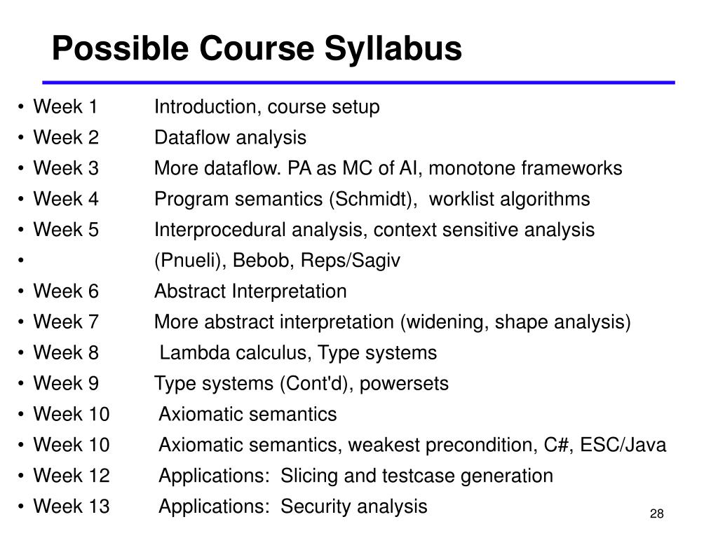 Possible Course Syllabus • Week 1 Introduction, course setup • Week 2 Dataflow analysis • Week 3 More dataflow. PA as MC of AI, monotone frameworks • Week 4 Program semantics (Schmidt), worklist algorithms • Week 5 Interprocedural analysis, context sensitive analysis • (Pnueli), Bebob, Reps/Sagiv • Week 6 Abstract Interpretation • Week 7 More abstract interpretation (widening, shape analysis) • Week 8 Lambda calculus, Type systems • Week 9 Type systems (Cont'd), powersets • Week 10 Axiomatic semantics • Week 10 Axiomatic semantics, weakest precondition, C#, ESC/Java • Week 12 Applications: Slicing and testcase generation • Week 13 Applications: Security analysis