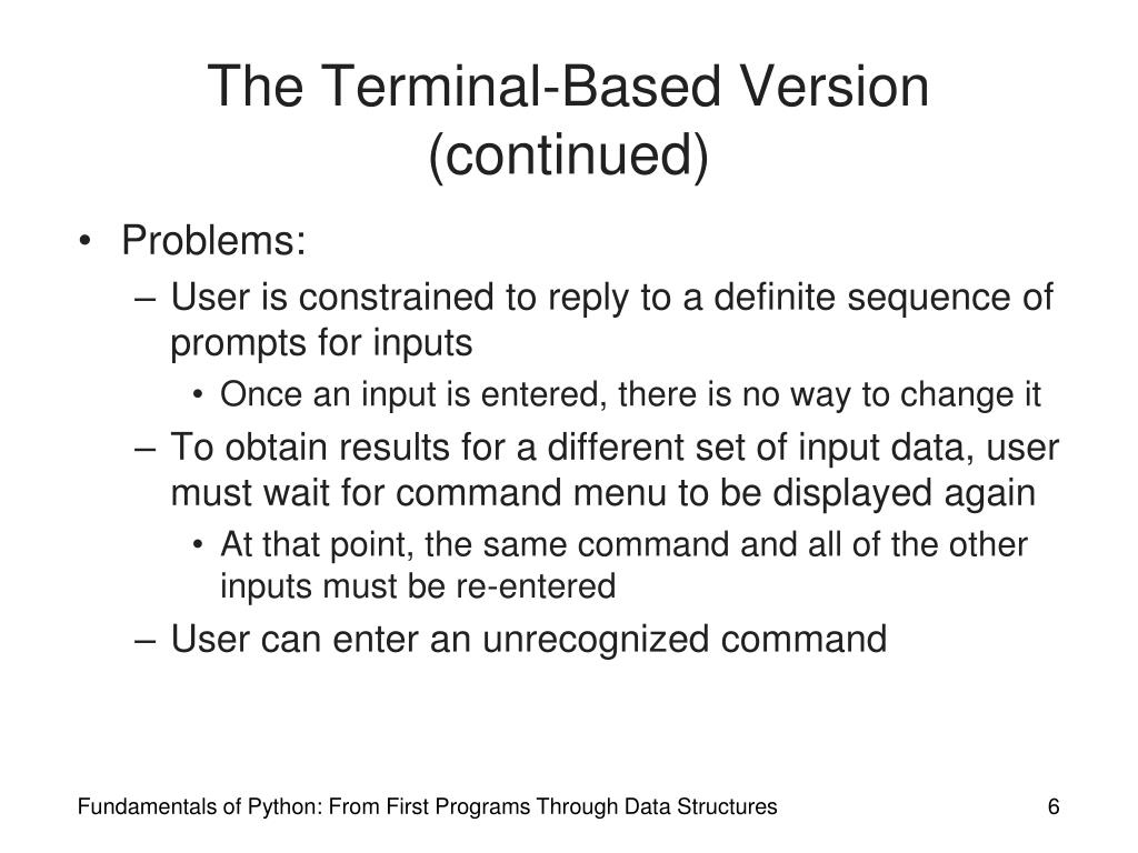 The Terminal-Based Version (continued) • Problems: • User is constrained to reply to a definite sequence of prompts for inputs • Once an input is entered, there is no way to change it • To obtain results for a different set of input data, user must wait for command menu to be displayed again • At that point, the same command and all of the other inputs must be re-entered • User can enter an unrecognized command Fundamentals of Python: From First Programs Through Data Structures