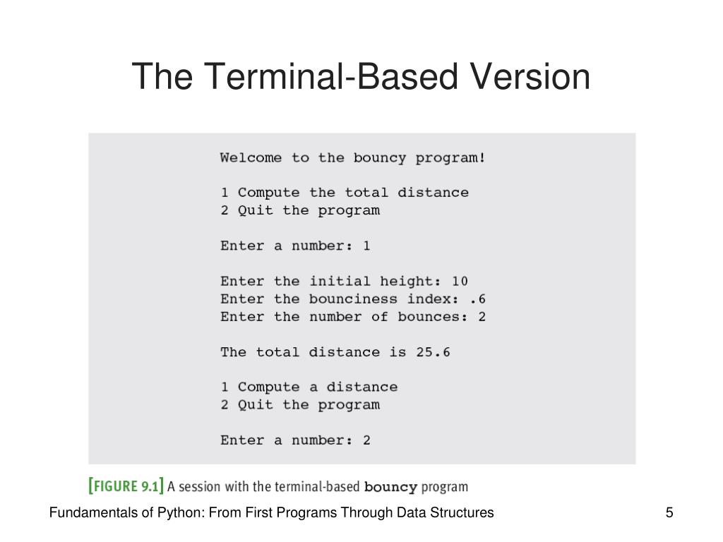 The Behavior of Terminal-Based Programs and GUI-Based Programs • Two different versions of the bouncy program from a user’s point of view: • Terminal-based user interface • Graphical user interface • Both programs perform exactly the same function • However, their behavior, or look and feel, from a user’s perspective are quite different Fundamentals of Python: From First Programs Through Data Structures