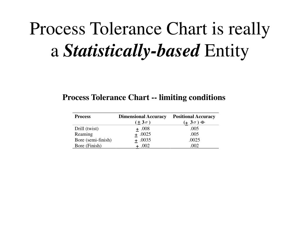 Process Dimensional Accuracy Positional Accuracy + ( 3 ) ( 3 ) s s + Drill (twist) .008 .005 + Reaming .0025 .005 + Bore (semi-finish) .0035 .0025 + Bore (Finish) .002 .002 + Process Tolerance Chart is really a Statistically-based Entity Process Tolerance Chart -- limiting conditions