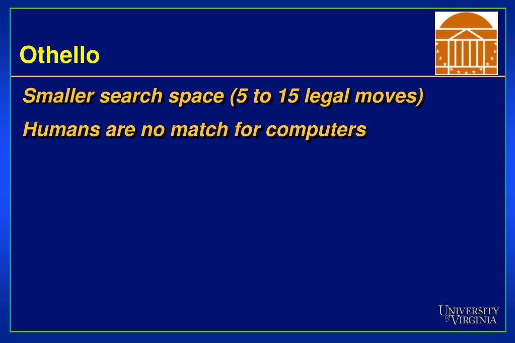 Othello • Smaller search space (5 to 15 legal moves) • Humans are no match for computers