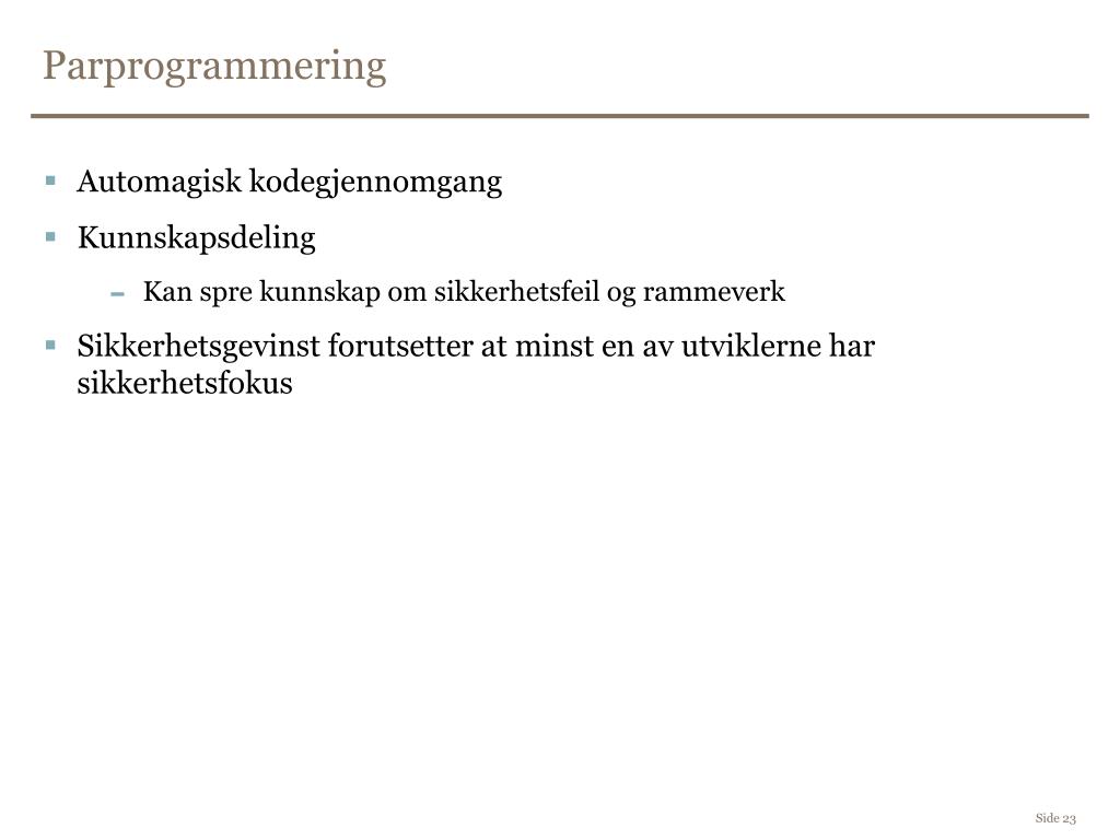 Parprogrammering • Automagisk kodegjennomgang • Kunnskapsdeling • Kan spre kunnskap om sikkerhetsfeil og rammeverk • Sikkerhetsgevinst forutsetter at minst en av utviklerne har sikkerhetsfokus