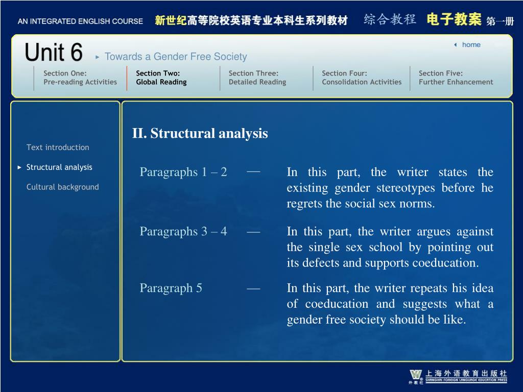 Towards a Gender Free Society 2-2 Section One: Pre-reading Activities Section Two: Global Reading Section Three: Detailed Reading Section Four: Consolidation Activities Section Five: Further Enhancement II. Structural analysis Text introduction Structural analysis — Paragraphs 1 – 2 In this part, the writer states the existing gender stereotypes before he regrets the social sex norms. Cultural background Paragraphs 3 – 4 — In this part, the writer argues against the single sex school by pointing out its defects and supports coeducation. Paragraph 5 — In this part, the writer repeats his idea of coeducation and suggests what a gender free society should be like.