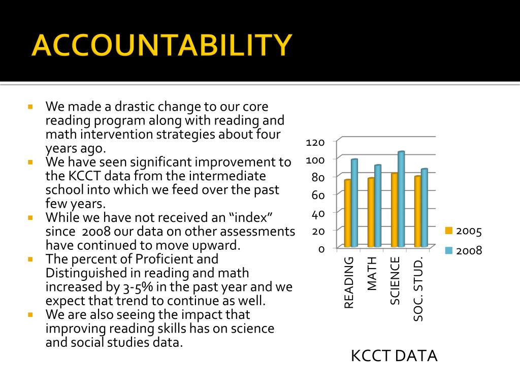 ACCOUNTABILITY • We made a drastic change to our core reading program along with reading and math intervention strategies about four years ago. • We have seen significant improvement to the KCCT data from the intermediate school into which we feed over the past few years. • While we have not received an “index” since 2008 our data on other assessments have continued to move upward. • The percent of Proficient and Distinguished in reading and math increased by 3-5% in the past year and we expect that trend to continue as well. • We are also seeing the impact that improving reading skills has on science and social studies data.
