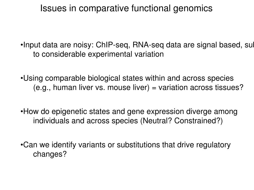 Issues in comparative functional genomics • Input data are noisy: ChIP-seq, RNA-seq data are signal based, subject • to considerable experimental variation • Using comparable biological states within and across species • (e.g., human liver vs. mouse liver) = variation across tissues? • How do epigenetic states and gene expression diverge among • individuals and across species (Neutral? Constrained?) • Can we identify variants or substitutions that drive regulatory • changes?