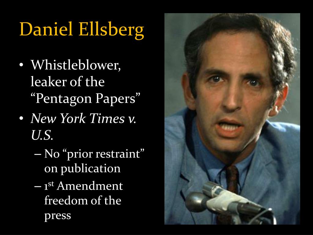Daniel Ellsberg • Whistleblower, leaker of the “Pentagon Papers” • New York Times v. U.S. • No “prior restraint” on publication • 1st Amendment freedom of the press