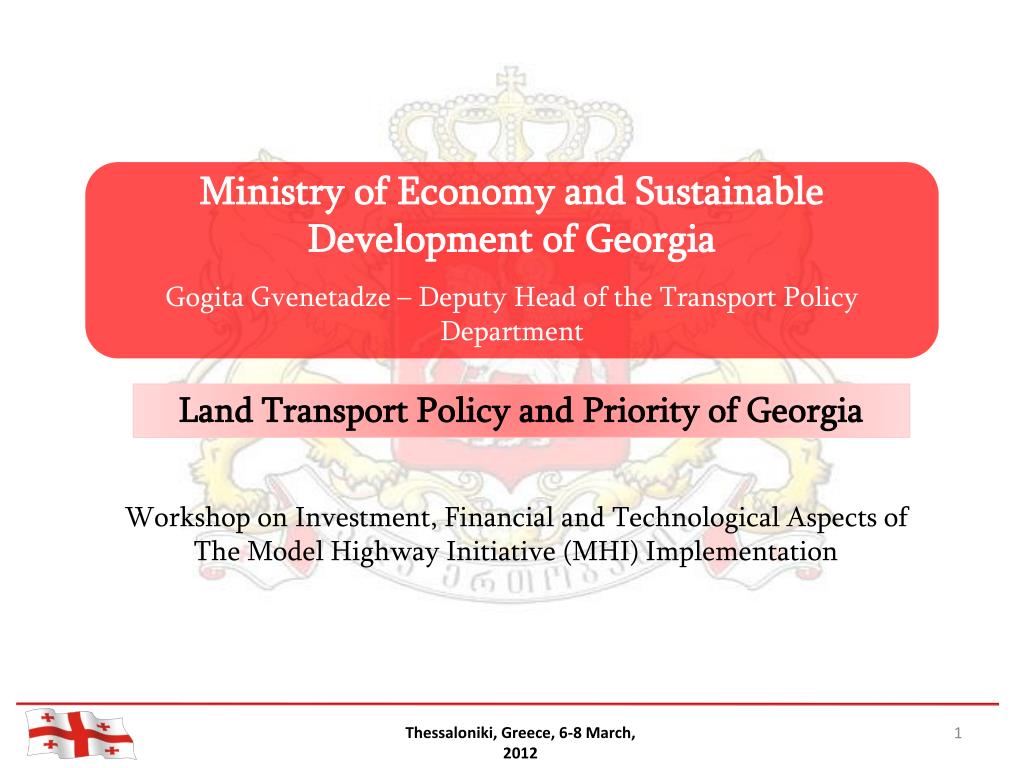 Ministry of Economy and Sustainable DevelopmentofGeorgia • GogitaGvenetadze – Deputy Head of the Transport Policy Department МИНИСТЕРСТВО ЭКОНОМИКИ И УСТОИЧИВОГОРАЗВИТИЯ ГРУЗИИДЕПАРТАМЕНТ ТРАНСПОРТНОЙ ПОЛИТИКИ Land Transport Policy and Priority of Georgia Workshop on Investment, Financial and Technological Aspects of The Model Highway Initiative (MHI) Implementation Ra sexvedraa, mishadaamate Thessaloniki, Greece, 6-8 March, 2012