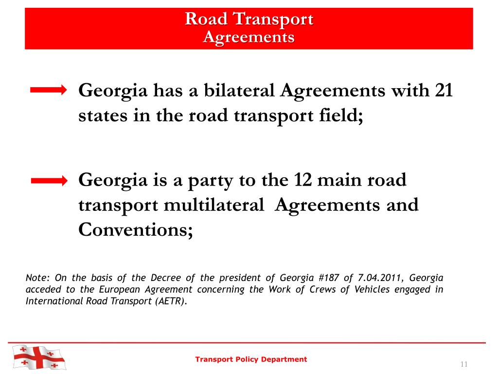 Road Transport Agreements • Georgia has a bilateral Agreements with 21 states in the road transport field; Georgia is a party to the 12 main road transportmultilateral Agreements and Conventions; Note: On the basis of the Decree of the president of Georgia #187 of 7.04.2011, Georgia acceded to the European Agreement concerning the Work of Crews of Vehicles engaged in International Road Transport (AETR). Transport Policy Department