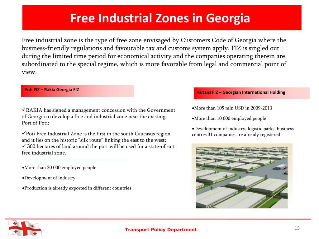 Free Industrial Zones in Georgia Free industrial zone is the type of free zone envisaged by Customers Code of Georgia where the business-friendly regulations and favourable tax and customs system apply. FIZ is singled out during the limited time period for economical activity and the companies operating therein are subordinated to the special regime, which is more favorable from legal and commercial point of view. Poti FIZ – Rakia Georgia FIZ Kutaisi FIZ – Georgian International Holding • More than 105 mln USD in 2009-2013 • More than 10 000 employed people • Development of industry, logistic parks, business centres 31 companies are already registered • RAKIA has signed a management concession with the Government of Georgia to develop a free and industrial zone near the existing Port of Poti; • Poti Free Industrial Zone is the first in the south Caucasus region and it lies on the historic “silk route” linking the east to the west; • 300 hectares of land around the port will be used for a state-of -art free industrial zone. • More than 20 000 employed people • Development of industry • Production is already exported in different countries Transport Policy Department