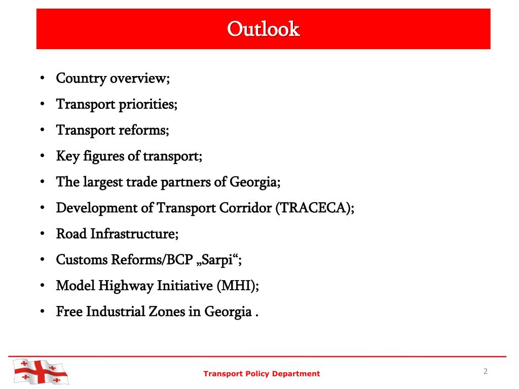 Outlook • Country overview; • Transport priorities; • Transport reforms; • Key figures of transport; • The largest trade partners of Georgia; • Development of Transport Corridor (TRACECA); • Road Infrastructure; • Customs Reforms/BCP „Sarpi“; • Model Highway Initiative (MHI); • Free Industrial Zones in Georgia . Transport Policy Department