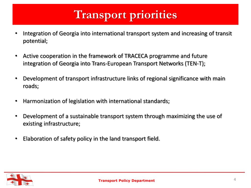 Transport priorities • Integration of Georgia into international transport system and increasing of transit potential; • Active cooperation in the framework of TRACECA programme and future integration of Georgia into Trans-European Transport Networks (TEN-T); • Development of transport infrastructure links of regional significance with main roads; • Harmonization of legislation with international standards; • Development of a sustainable transport system through maximizing the use of existing infrastructure; • Elaboration of safety policy in the land transport field. Transport Policy Department