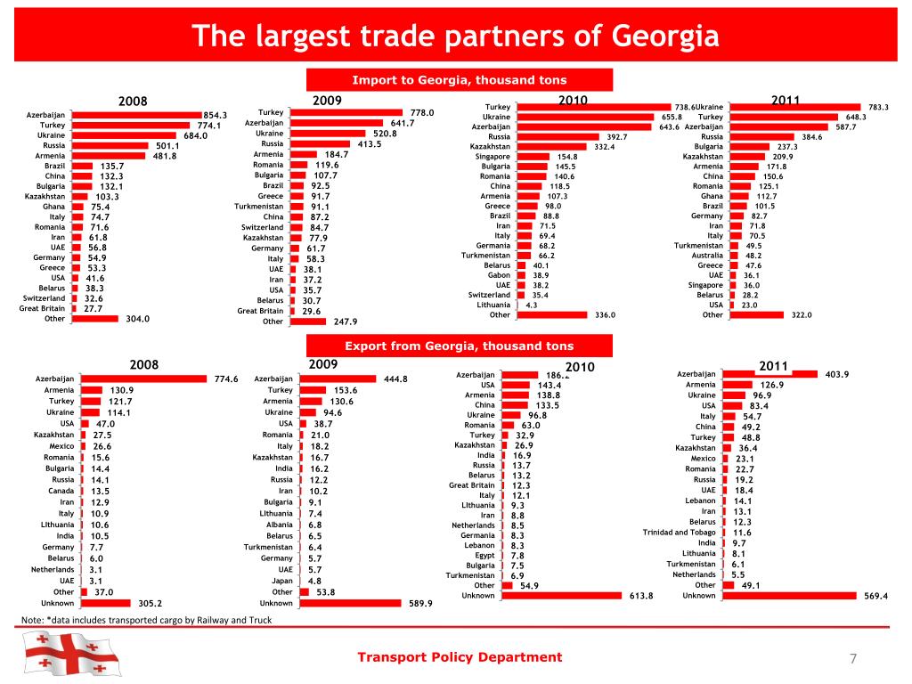 The largest trade partners of Georgia Import to Georgia, thousand tons Export from Georgia, thousand tons Note: *data includes transported cargo by Railway and Truck Transport Policy Department