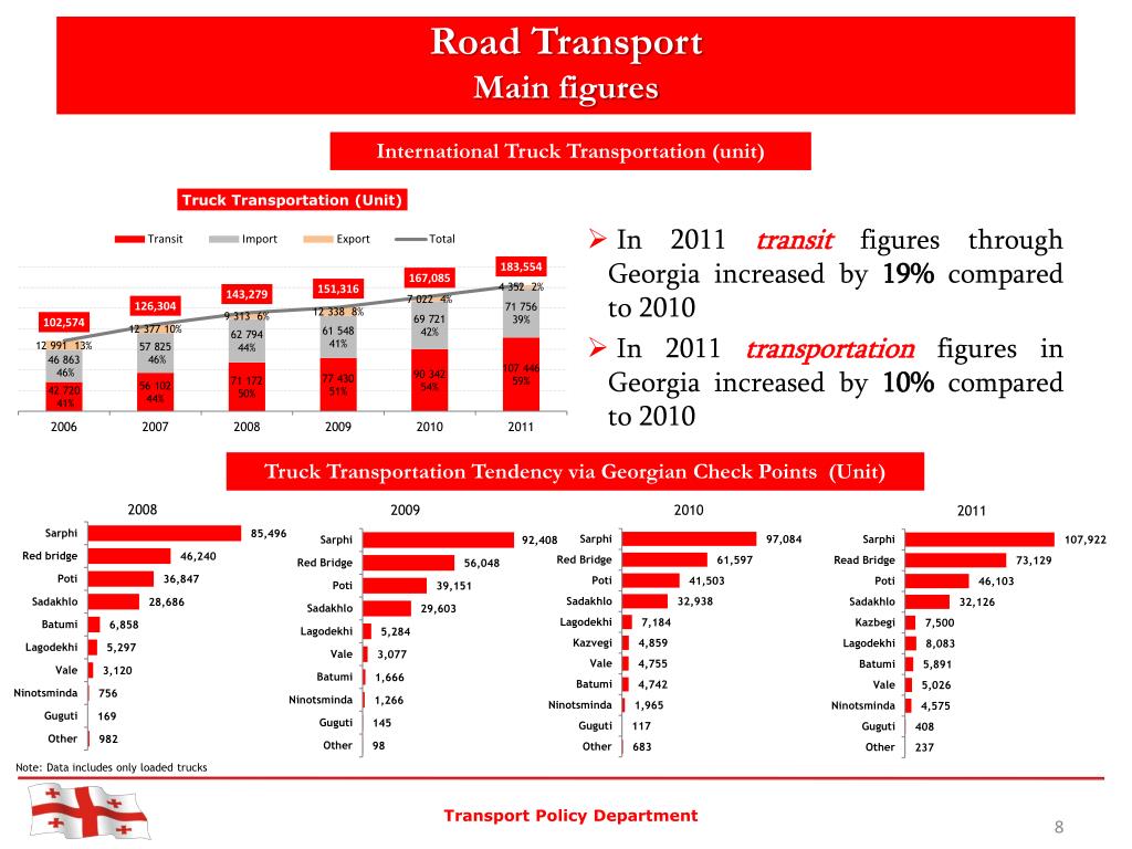 Road Transport Main figures International Truck Transportation (unit) • In 2011 transit figures through Georgia increased by 19% compared to 2010 • In 2011 transportation figures in Georgia increased by 10% compared to 2010 Truck Transportation Tendency via Georgian Check Points (Unit) Note: Data includes only loaded trucks Transport Policy Department
