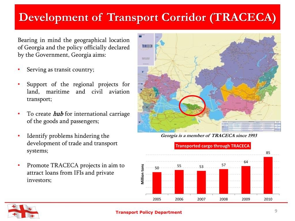 Development of Transport Corridor (TRACECA) • Bearing in mind the geographical location of Georgia and the policy officially declared by the Government, Georgia aims: • Serving as transit country; • Support of the regional projects for land, maritime and civil aviation transport; • To create hub for international carriage of the goods and passengers; • Identify problems hindering the development of trade and transport systems; • Promote TRACECA projects in aim to attract loans from IFIs and private investors; Georgia is a member of TRACECA since 1993 Transport Policy Department