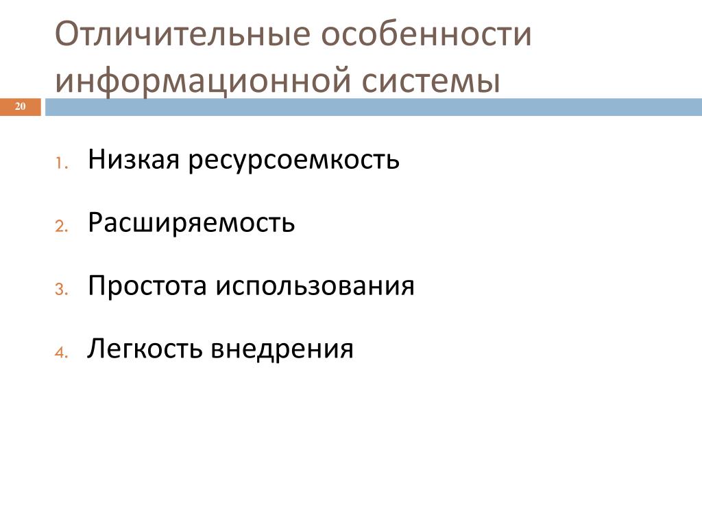 Отличительные особенности информационной системы • Низкая ресурсоемкость • Расширяемость • Простота использования • Легкость внедрения