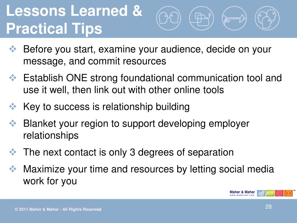 Lessons Learned & Practical Tips • Before you start, examine your audience, decide on your message, and commit resources • Establish ONE strong foundational communication tool and use it well, then link out with other online tools • Key to success is relationship building • Blanket your region to support developing employer relationships • The next contact is only 3 degrees of separation • Maximize your time and resources by letting social media work for you