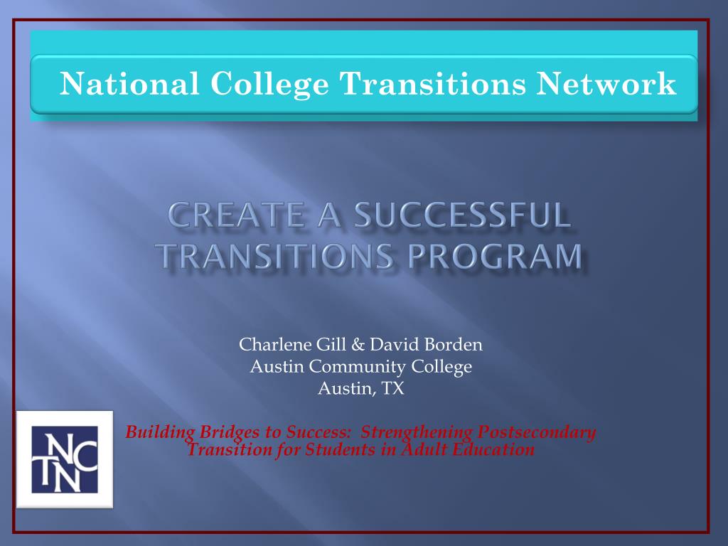Create a Successful Transitions Program Charlene Gill & David Borden Austin Community College Austin, TX Building Bridges to Success: Strengthening Postsecondary Transition for Students in Adult Education
