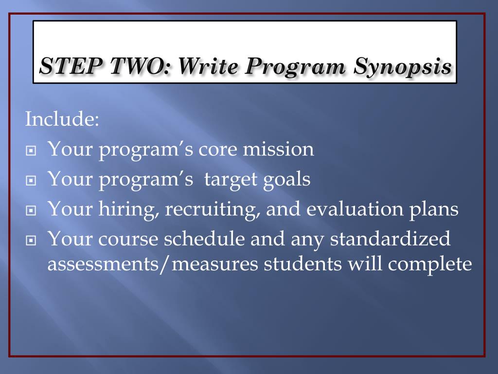 STEP TWO: Write Program Synopsis Include: • Your program’s core mission • Your program’s target goals • Your hiring, recruiting, and evaluation plans • Your course schedule and any standardized assessments/measures students will complete