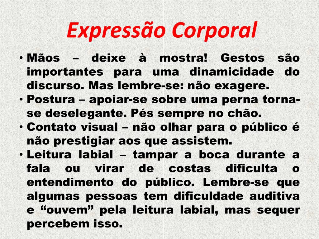 Expressão Corporal • Mãos – deixe à mostra! Gestos são importantes para uma dinamicidade do discurso. Mas lembre-se: não exagere. • Postura – apoiar-se sobre uma perna torna-se deselegante. Pés sempre no chão. • Contato visual – não olhar para o público é não prestigiar aos que assistem. • Leitura labial – tampar a boca durante a fala ou virar de costas dificulta o entendimento do público. Lembre-se que algumas pessoas tem dificuldade auditiva e “ouvem” pela leitura labial, mas sequer percebem isso.