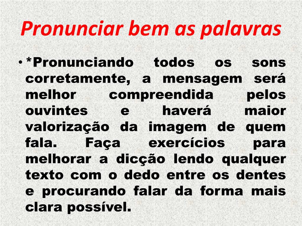 Pronunciar bem as palavras • *Pronunciando todos os sons corretamente, a mensagem será melhor compreendida pelos ouvintes e haverá maior valorização da imagem de quem fala. Faça exercícios para melhorar a dicção lendo qualquer texto com o dedo entre os dentes e procurando falar da forma mais clara possível.